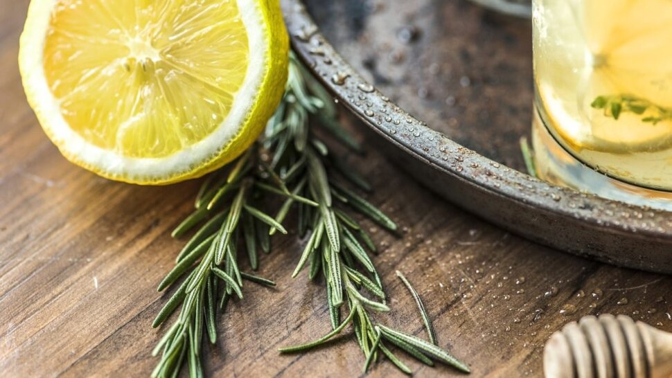 Luego pon el fuego a temperatura baja y añade las agujas de romero y las rodajas de limón en la olla.